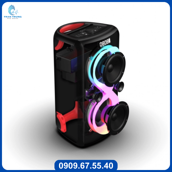 Nổi bật trên tấm ê – căng ở mặt trước là 2 vành loa bass được trang bị ánh sáng LED RGB đa sắc sẽ chuyển động theo điệu nhạc, người dùng cũng có thể điều chỉnh theo nhiều chế độ khác nhau.