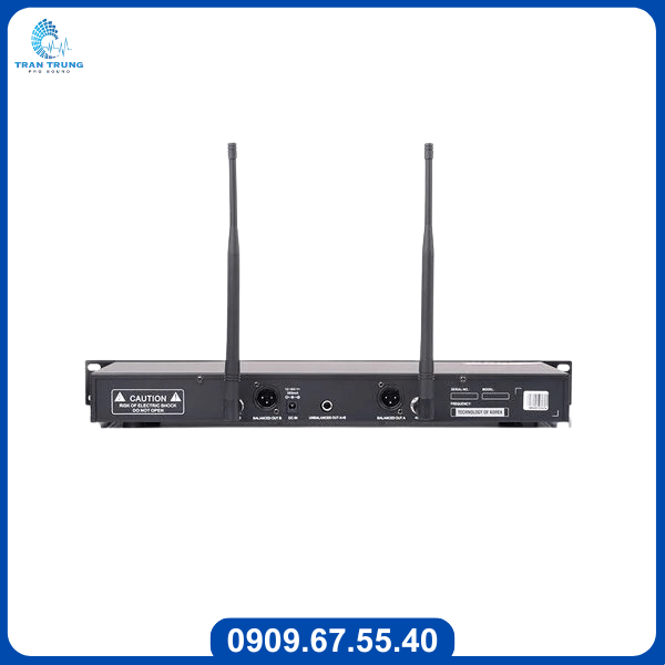 Về phần receiver: được thiết kế với phiên bản vuông vắn, tinh tế và sang trọng. Nổi bật là màn hình LCD hiển thị các thông số hoạt động của 2 kênh mic. Kế bên màn hình là các nút chức năng như: Nút điều chỉnh âm lượng, nút set để cài đặt tần số và đèn IR thu sóng hồng ngoại. Mặt sau đầu thu sẽ có đầy đủ các cổng cắm chuyên biệt, giúp chúng ta dễ dàng thao tác lắp đặt như: 2 cổng out canon,1 cổng out 6 ly dùng cho Mic, 1 lỗ cắm Adaptor nguồn và 2 đầu ăng ten thu sóng.